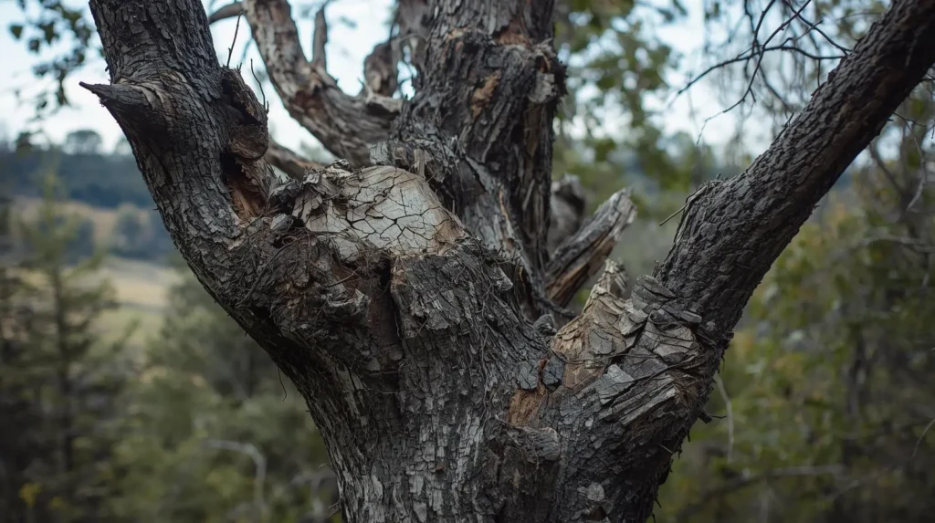 - Large cracks in the trunk or main branches